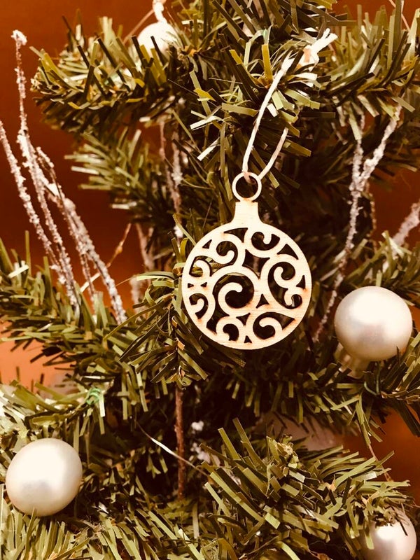 Decoratieve houten kerstbal met krullen en ophang gat met koord. Deze houten kerstbal is te in de volgende maten: