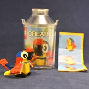 Melkbus met LEGO papagaai.Door de sleuf uit het deksel te drukken kan je de melkbus als spaarpot gebruiken.Afmeting: rond 83 x 148mm